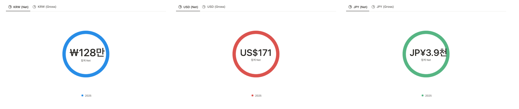 2025년 누적은 128만, 171달러, 3900엔입니다. 연금저축계좌와 ISA에 배당주를 열심히 늘리고 있습니다.
