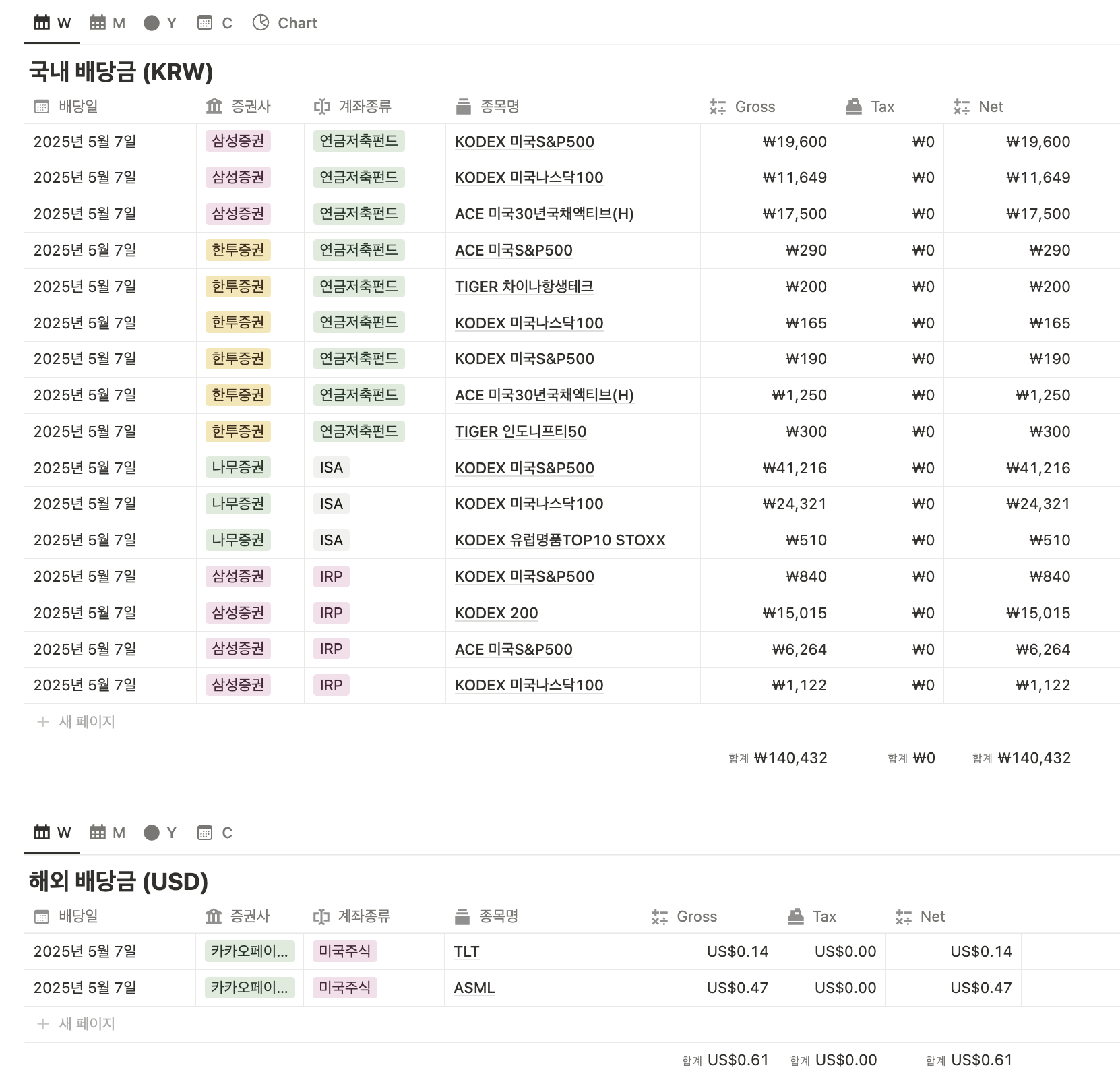 연금저축펀드, ISA, IRP에서 주로 투자하고 있는 지수형 ETF 배당이 한 번에 들어오는 주였습니다. 금액은 소소하지만 건수가 많네요. 모두 절세 계좌라 세금은 0원이고, 14만원 정도 받았습니다. 모두 다시 재투자!