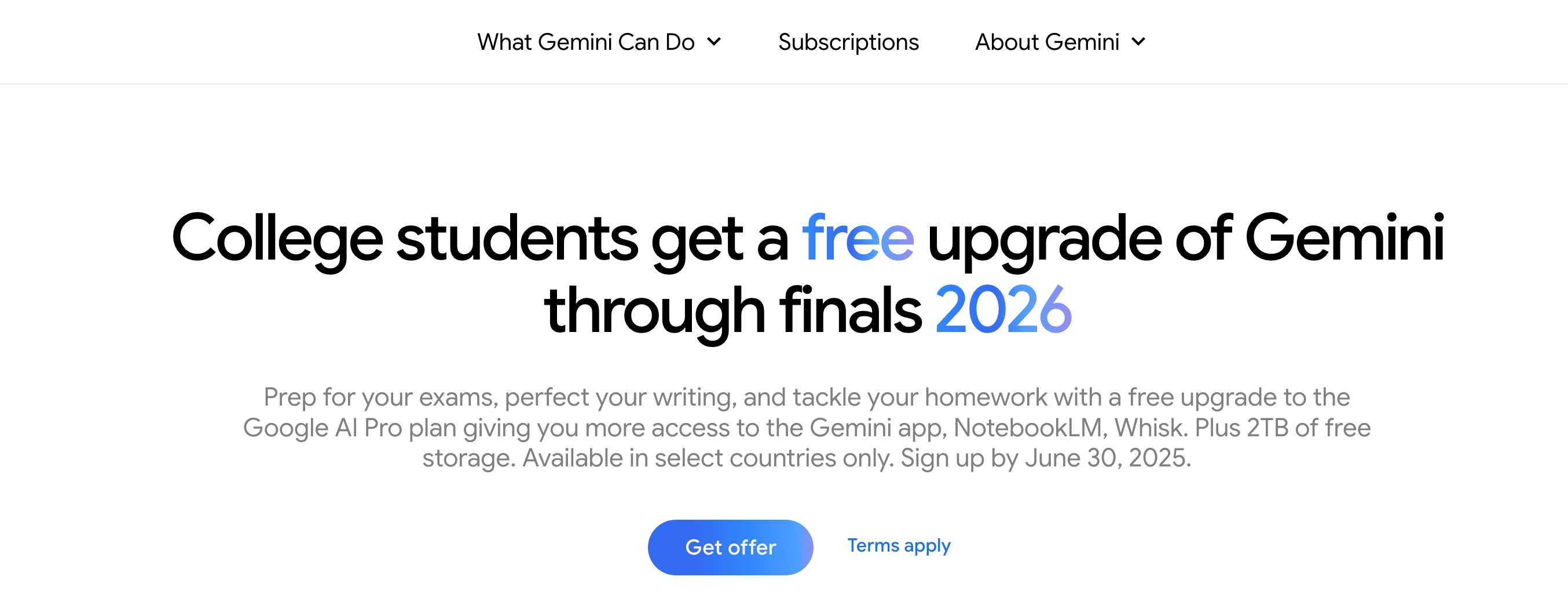 Gemini를 1개월 무료 체험으로 쓰고 있다가 끝나기 하루 전에 대학생 무료 업그레이드 프로모션을 하나 발견해서 뚫었다(?) 6월 30일까지 신청할 수 있는데 지금 신청하면 2026년 9월까지 무료로 쓸 수 있음. 1개월에 거의 3만원돈이니까 40만원이 넘는 이득. 요즘 ChatGPT에서 Gemini로 갈아탔는데 아주 나이스 타이밍.