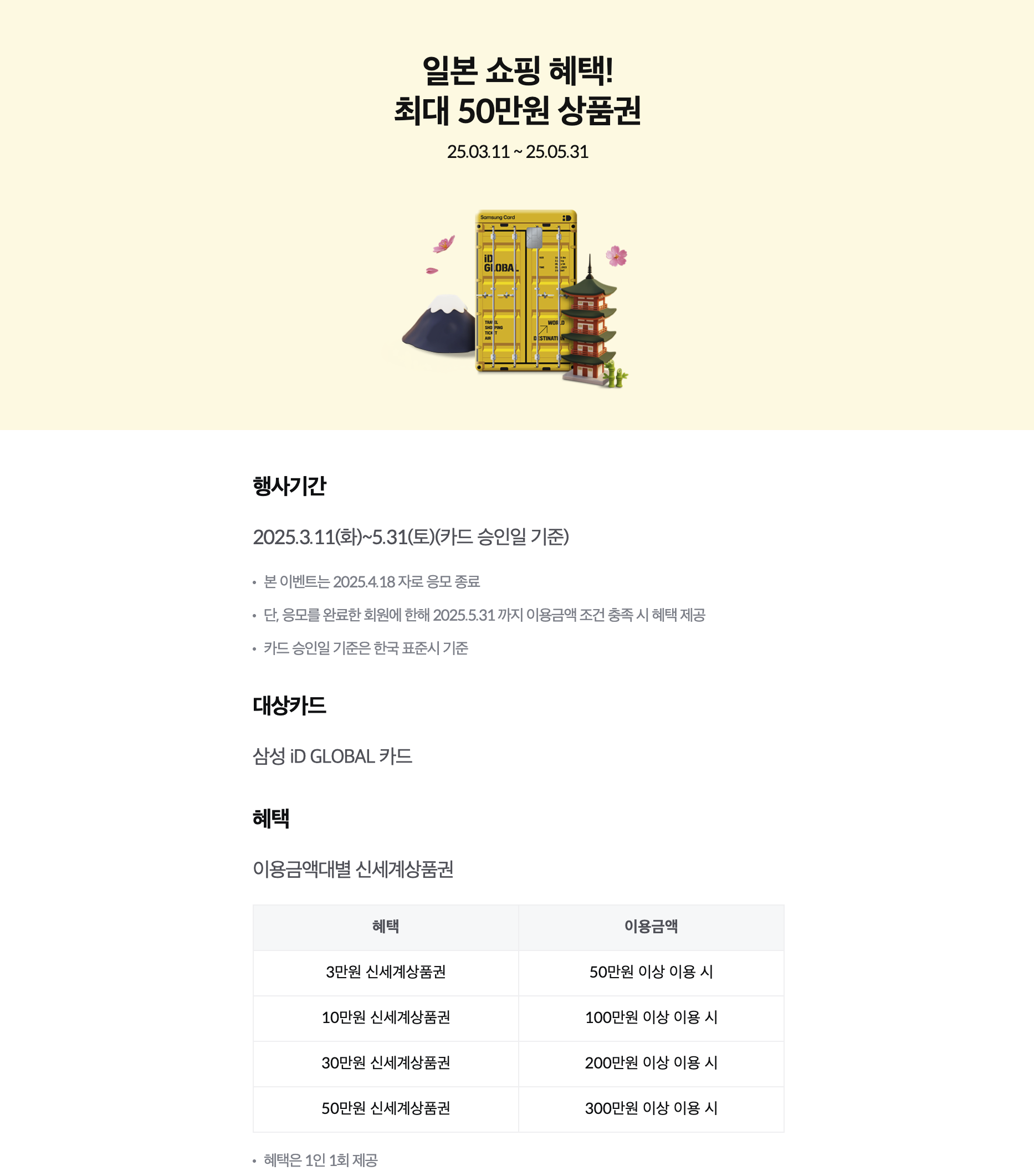 3월부터 5월까지 현재 쓰고 있는 삼성 카드 이벤트가 있어서 응모했었는데, 마침 이 시기에 일본 여행을 2번 다녀와서 상품권을 받았다.