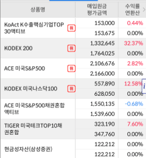 현재 투자 중인 퇴직연금 종목 현황. 다른 건 크게 눈여겨볼 건 없고, KODEX200 수익률이 30퍼를 넘어섰다.