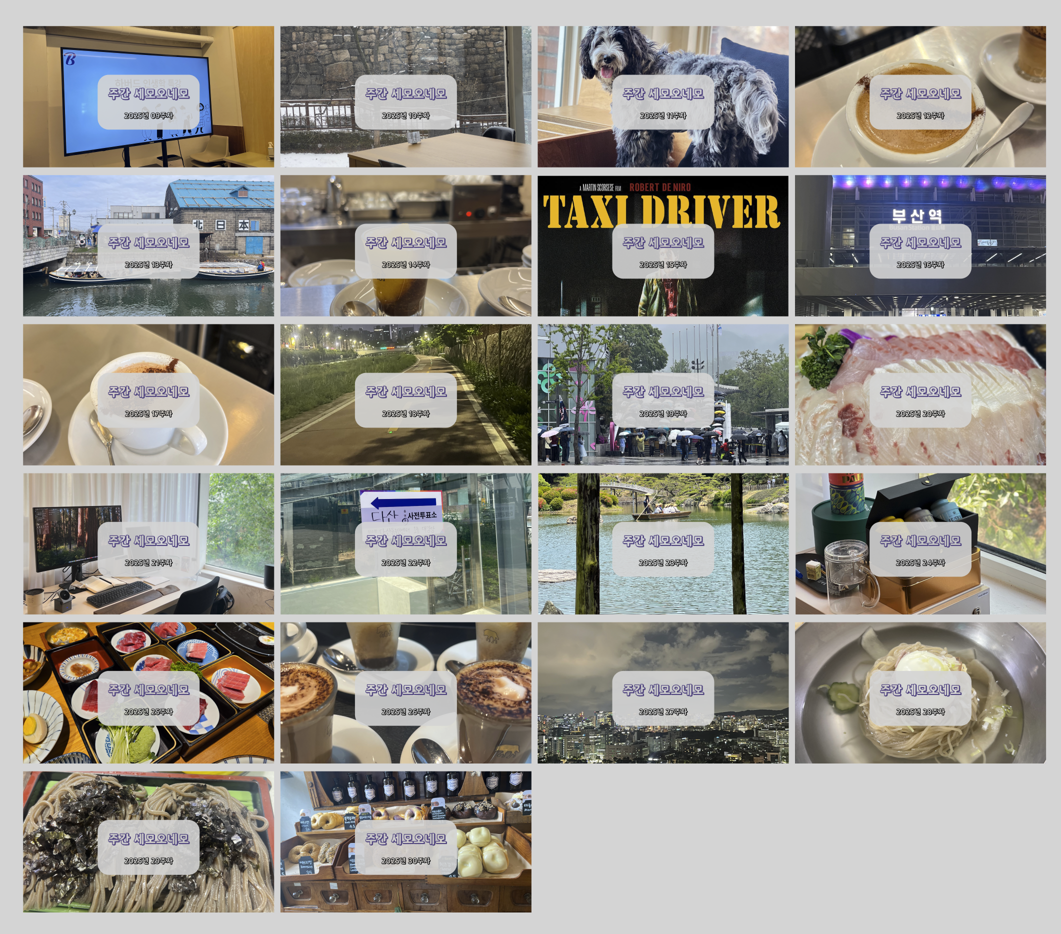 올해 9주차부터 쓰기 시작한 주간이 어느덧 30주차를 달성했다. 이렇게 모아논 걸 보면 항상 드는 생각은 1주차부터 쓸 걸. 역시 꾸준하려면 생각을 비우고 그냥 계속 해야 된다. 모아보니 매주 무엇을 했는지 파노라마처럼 지나간다. 사진을 좀 더 찍어서 간직해봐야겠다.