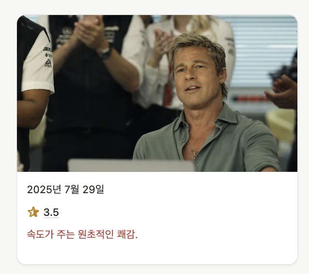 오랜만에 영화 관람. 계속 보고 싶었던 영화인데 개봉한지 한 달이 지나서야 봤네. 돌비나 아이맥스에서 봤으면 더 좋았겠다 싶다. 쿠팡플레이에서 F1 중계를 하면서 인기가 많아졌다고 하는데, 이 영화를 보고 F1에 푹 빠진 사람들도 많아진 것 같다.