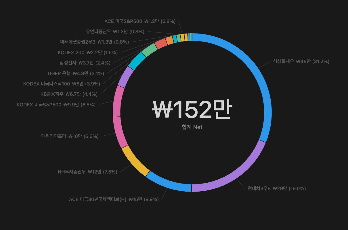 연간 국내 배당 현황인데, ACE 미국30년국채액티브(H)도 월배당이라 그런지 어느덧 10퍼 비중이나 되네. 아직 장기채 수익률이 그렇게 좋지 않지만 헷지 차원에서 투자하는 거라 오래 들고 갈 생각. 오래 들 주식인데 배당까지 주면 땡큐. ㅎㅎ