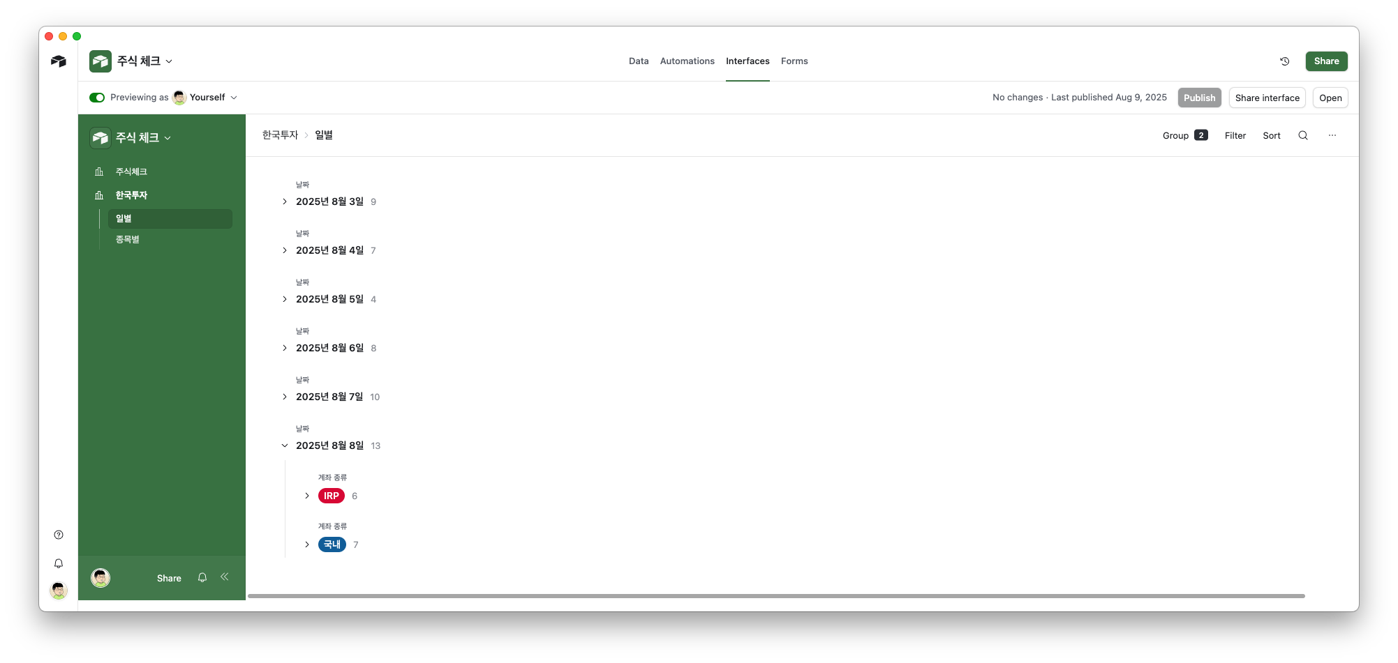 한투에서 가져온 데이터는 Airtable에 차곡차곡 쌓는 중. 개인적으로 모든 증권사가 지원하면 좋겠는데 아직 증권사 쪽 전산은 한참 멀었다.