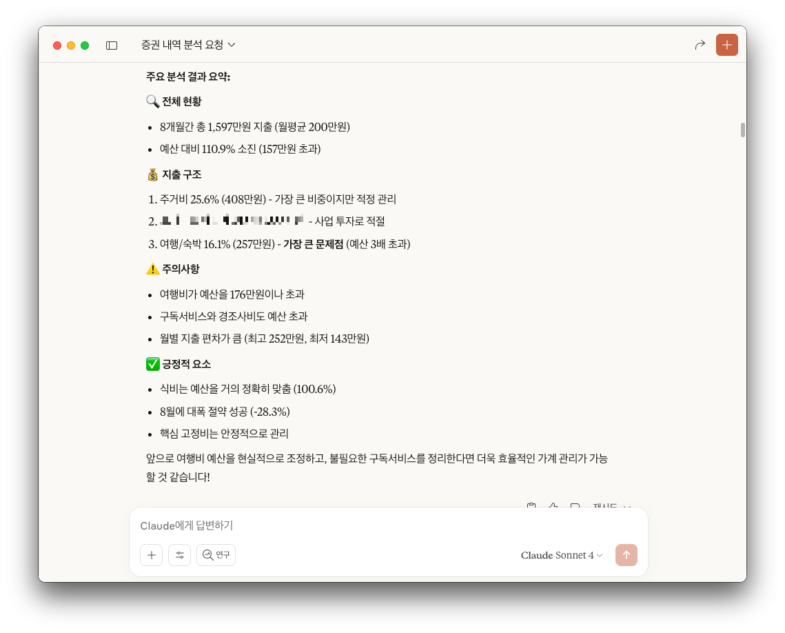 클로드 MCP로 노션 가계부 분석을 시켜보니까 아래처럼 레포트해준다. Chat GPT, Gemini만 쓰다가 8월부터 클로드도 써보고 있는데 얘도 좋다. 디지털 월세가 너무 많아서 좀 줄이려고 했는데, AI쪽은 확실히 아끼면 안 될 것 같다. 그만큼 뽑아내야지.