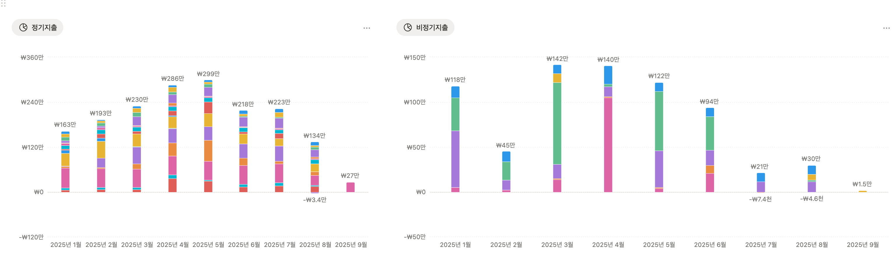 노션 가계부를 리뉴얼했다. 노션 가계부 처음 만들 때는 수식 생각하느라 머리 깨지는 줄 알았는데, 요새 클로드랑 제미나이 덕분에 수월하게 하는 중. 예산을 초과하면 red, 90% 이상 썼으면 yellow, 그 이하로는 green으로 표시되게 만들었다. 확실히 세금, 여행 등 이벤트가 있었던 3~6월의 지출이 좀 컸다. 7월부터는 소비가 많이 줄어서 안정적.