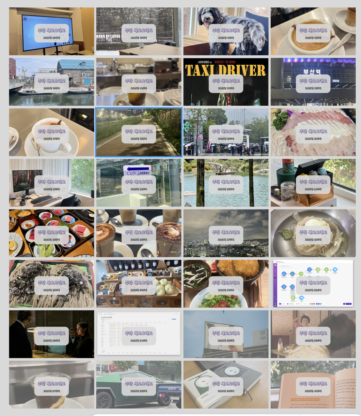 올해 9주차부터 시작했던 주간 세모오네모가 어느덧 40주차를 넘어섰다 :) 이렇게 대문 사진을 모아보니 뿌듯! 52주까지 계속 이어가자!