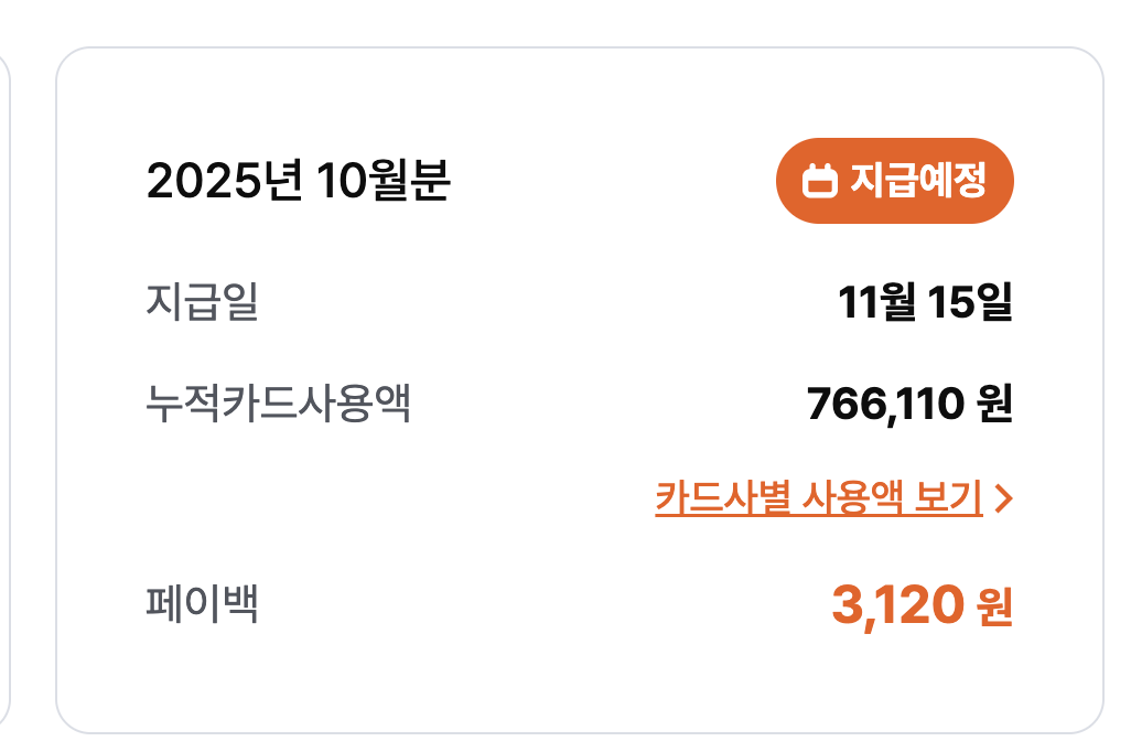 작년 9~11월에 돈을 꽤 많이 써서 그런지, 올해 상생페이백 받기가 어렵다. 9월엔 못 받았고, 10월에는 작년보다 조금 더 써서 3천원이 환급된다. 11월은 더 쓸 것 같아서 잘하면 10만원까지 환급받을 수 있을 듯? ㅎㅎ