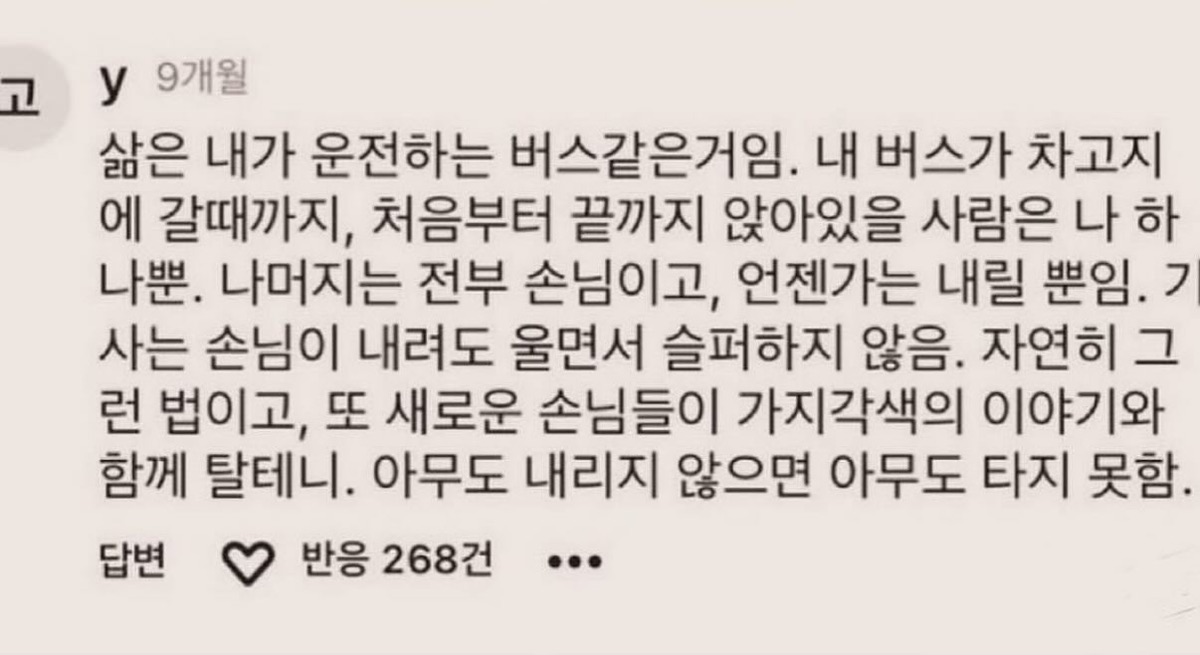 어디서 발견한지 모르겠는데 캡쳐해뒀던 것. 삶은 내가 운전하는 버스. 아무도 내리지 않으면 아무도 타지 못한다. 공감.