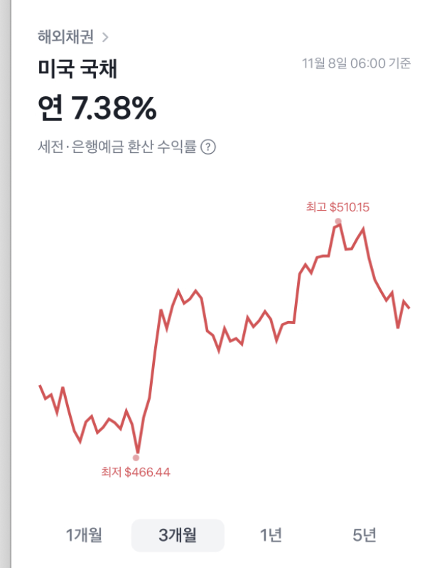 미 금리가 중단기적으로 인하할 것 같아서, 25년물 미국 국채를 들고 있는데 요즘 경제 상황을 보면 금리가 떨어질 것 같지가 않다. 그래서 국채도 요동치는 중. 수익은 보고 있지만 환차익 빼면 거의 지지부진. 12월에 금리 인하 결정하는 거 보고 계속 들고 갈지 고민해봐야겠다.