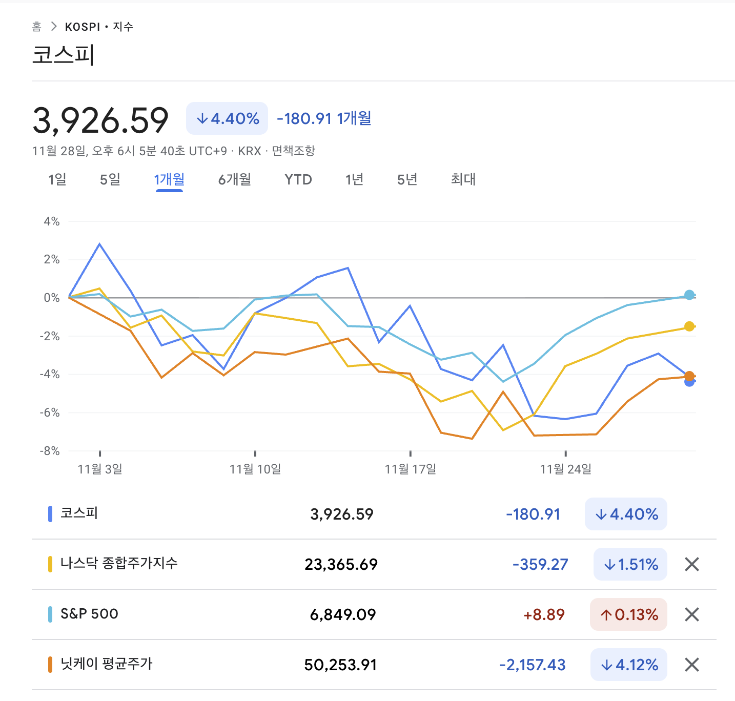 11월은 수익이 그렇게 많지는 않았지만 나쁘지 않았다. 이제 슬슬 이사를 앞두고 있어서 국내 주식은 많이 정리했다. 펀드는 확실히 코스피 지수를 추종하고 있어서 거의 비슷하게 흘러간다.