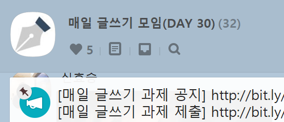 매일 글쓰기 모임을 시작했습니다. 전체 인원은 서른 둘이고 끝까지 몇 명이나 살아남을지 궁금합니다. 많은 인원들이 살아남았으면 하네요. ㅎㅎㅎ