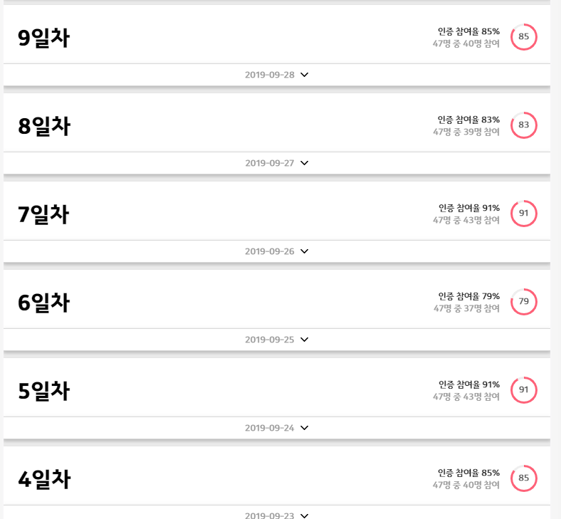 카카오프로젝트100은 열심히 진행되고 있습니다. 47분 중 평균 40분 정도가 매번 인증해주시는 거 같아요. 단톡방도 활발하고, 책도 다들 열심히 읽어주셔서 저도 계속 자극받고 있네요. 100일동안 지금 페이스 계속 유지되었으면 하는 바람입니다! 매일글쓰기도 어느덧 DAY17까지 진행되었습니다. 이제 3주만 더 진행되면 글쓰기도 마무리가 되네요. 모임이 끝날 때마다 브런치에 후기 글을 하나씩 써보려고 하는데, 어떤 후기 글이 나올지 저도 기대되네요. 쓰기 전까지 글감을 열심히 모아봐야겠어요.